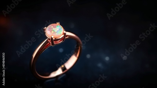 An opal stone set in a rose gold ring floating on a background of black space