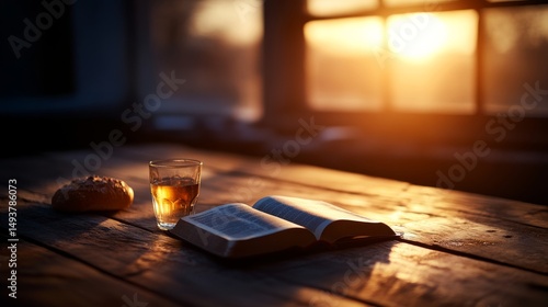 An open Bible rests on a rustic wooden table beside a glass of water and a small loaf of bread, softly lit by warm light in a contemplative evening atmosphere