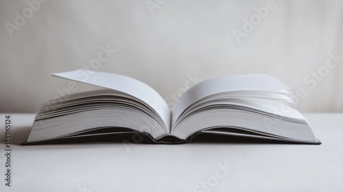 An open book with blank pages lies on a flat surface, showcasing its simple, minimalistic design and inviting creativity.