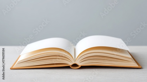 An open book with blank pages, resting on a light surface, against a simple background.
