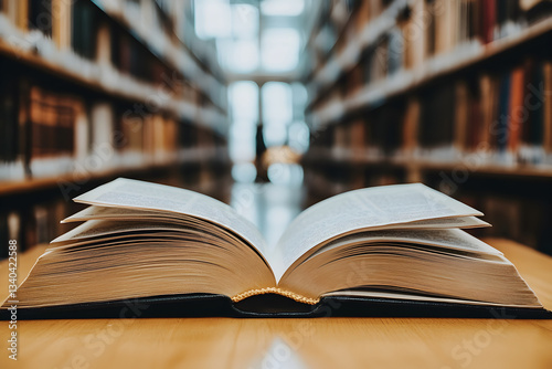 An open book with slightly curled pages, resting on a smooth wooden table, surrounded by blurred bookshelves