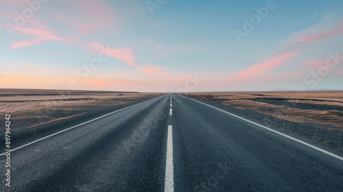 An open, empty road stretching into the horizon under a wide, uncluttered sky at dawn