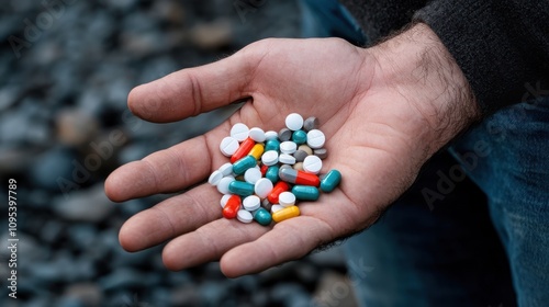 An open hand presents a diverse array of pills against a blurred natural backdrop, symbolizing the availability and complexity of medical choices in nature.