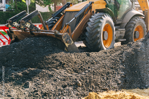 an open pit with a loader for laying pipes. a paved road to improve communications in the city. preparation of trenches for construction work