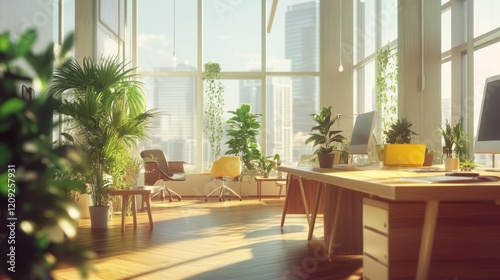 An open-plan coworking office with modern wooden furniture, vibrant indoor plants, and large windows allowing sunlight to stream in.