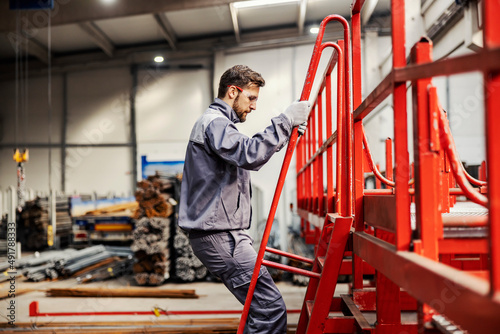 An operator climbing on machine to check on it in steel factory.