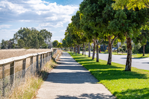 An orderly, tree-lined street provides pleasant shade over the footpath in a suburban neighborhood in Melbourne, creating a lush and comfortable environment for pedestrians.Williams Landing, Australia