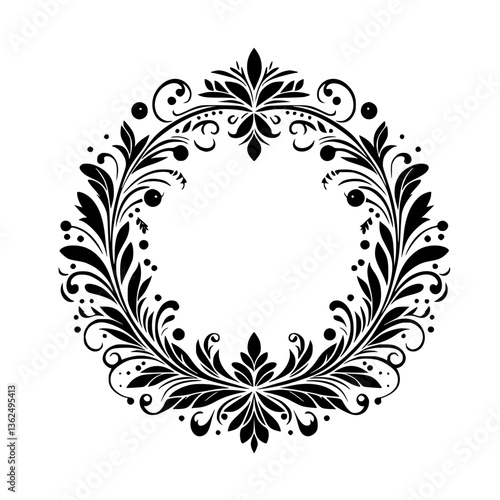 An ornate, symmetrical black and white floral wreath design, featuring detailed leaves, flourishes, and dots, creating a circular frame on a white background, evocative of elegance.
