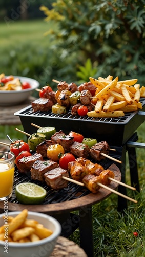 An outdoor barbecue party with assorted meat skewers and golden fries in a festive setting.