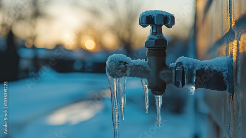 An outdoor faucet in winter with icicles hanging from it, against a blurred snowy background. --chaos