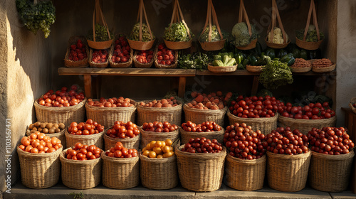 An outdoor market stall with fruits and vegetables in wooden baskets and reusable bags