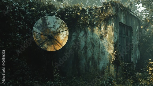 An overgrown building features a large, weathered satellite dish, entwined with vines, creating a hauntingly beautiful scene in nature.