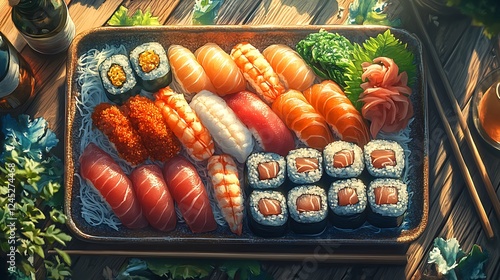 sushi, platter, sashimi, dragon, radish, wasabi, ginger, pickled, tray, japanese, chopstick, sake, bottle, ambient, lighting, artistic, fresh, plated, vibrant, inviting, epicure, crisp, wholesome, elegant, refined, alimentary, bold, satisfying, comforting, hearty