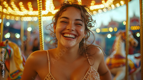 overweight, woman, riding, carousel, fair, laughing, holding, horse, information technology, goes, around, bright, light, carnival, music, filling, scene