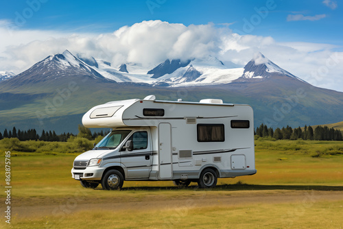 An RV parked on a lawn with a grassland and endless mountains and lake in the background. Motorhome, trailer in nature. Generative AI tools