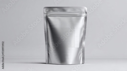 An unbranded silver doypack with a blank label stands ready for custom food or product branding.