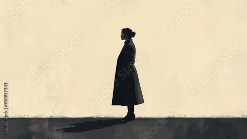 An understated, minimalist illustration of a person standing with a calm, confident posture, wearing a demure outfit in monochrome tones
