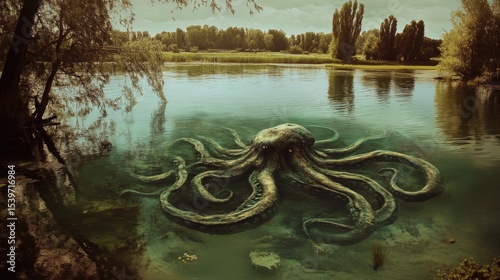 lake, river, water, monster, tentacle, creature, underwater, deep, lagoon, sea, green, aquatic, nature, landscape, wilderness, tree, calm, dangerous, horror, giant, beast, unseen, mystery, mysterious, surface, eye, eye, forest, tranquil, shore, bank, grass, shadow, sunlight, dramatic, ominous, dark, fear, skittish, haunting, eerie, submerged, ripple, light, cloudy, tree branch