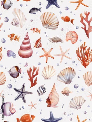 An underwater world featuring sea creatures in a seamless aquatic pattern rendered in watercolor style