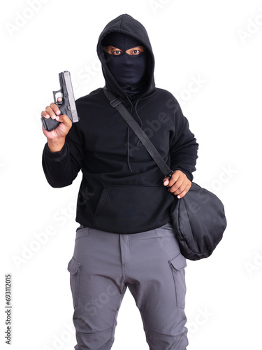 An unidentified male criminal wearing a black hoodie and covering his face, holding a handgun and carrying a large black money bag. On a white background with a cliping path.