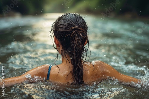 An unrecognizable woman enjoys a tranquil swim in a river, showcasing the beauty and solitude of nature