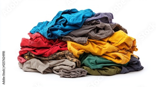An unruly stack of dirty clothing in various colors, haphazardly arranged, stands out against an immaculate white backdrop, patiently awaiting its turn for washing and care