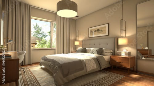 double, bed, sleek, headboard, bedside, table, modern, vanity, table, mirror, the, room, has, hardwood, floor, plush, carpet, pendant, light, lamp, catered, illumination, window, curtain, in, natural, creating, contemporary, inviting, atmosphere, from, corner, or