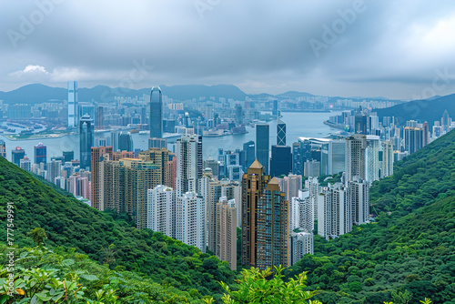 An urban skyline overshadowed by lush greenery, contrast between nature and city life in a bustling metropolis.