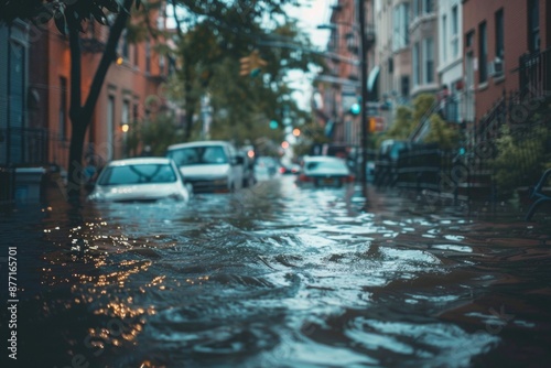 An urban street is swamped with floodwaters, submerging parked cars and trees. The aftermath of heavy rainfall creates a dramatic scene of urban flooding