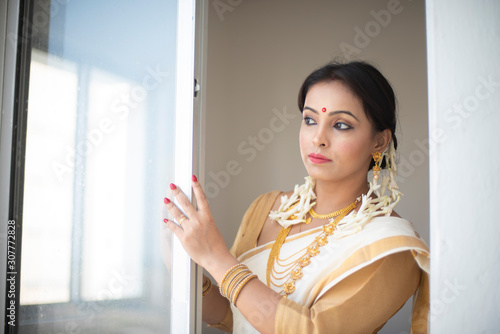 An young and attractive Indian woman in white traditional wear is smiling while standing in front of a glass window for the celebration of Onam/Pongal in white background. Indian lifestyle.
