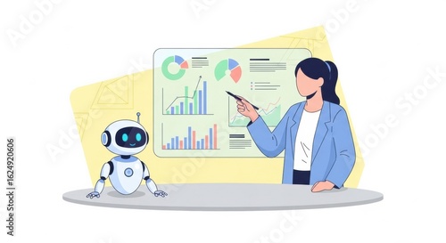 robot, assistant, datum, analysis, presentation, business, graph, chart, woman, pointing, technology, ai, future, modern, smart, artificial, intelligence, learning, machine, innovation, automation, digital, manpower, collaboration, teamwork, strategy, information, report, finance, marketing, sale, consulting, development, management, leadership, planning, growth, progress, success, performance