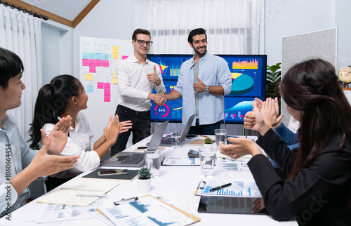 Analyst team leader shake hand with his colleague after successful data analysis meeting using FIntech software power with business intelligence or BI dashboard. Prudent
