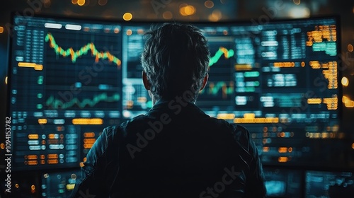 stock, market, finance, datum, analysis, chart, graph, trading, investment, business, economy, technology, computer, screen, monitor, desktop, digital, statistic, financial, information, number, trend, pattern, software, analyst, investor, trader, professional, work, office, dark, night, blue, green, backlit, silhouette, focused, concentrated, serious, intense, man, person, desk, keyboard, mouse, background