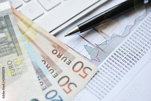 Analyzing investment or business charts with computer keyboard and euro banknotes