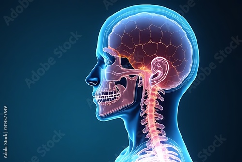 Anatomical examination of the human skull and spine digital illustration health science dark background side view