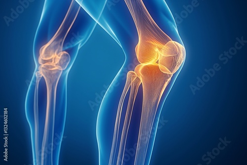 Anatomical illustration of a human knee joint showing ligaments and cartilage in vibrant colors.