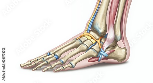 medicals, anatomy, cardiovascular, nervous, muscular system, foot, illustration, bone, bone, ligament, muscle, muscle, skeletal, system, health care, human, body, biological, science, shinbone, fibula, cuneiform, metatarsal, phalanx, tendon, tissue, skeleton, joint, joint, ankle, lower, leg, limb, dorsal, medial, lateral, anterior, posterior, diagram