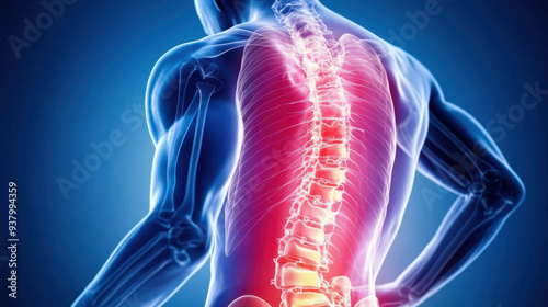 Anatomical illustration showcasing a human spine with highlighted areas indicating potential pain or discomfort in the lower back region