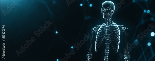Anatomy Exploration: A captivating digital artwork showcases a detailed, see-through rendering of the human skeletal structure set against a cool blue backdrop.