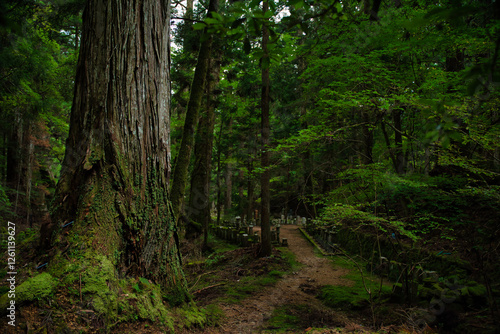 Ancient cemetery at sunset inside a forest, on Mount Koya, Okuno-in or Okunoin cemetery is a sacred area cemetery. In Wakayama prefecture, south of Osaka in Japan.