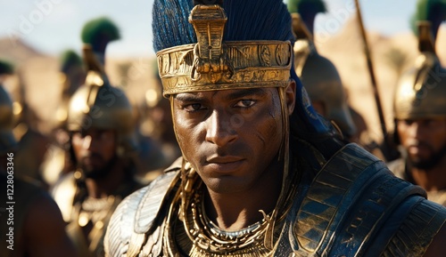 pharaoh, egypt, ancient, king, royals, soldier, army, warrior, powerful, majestic, leader, gold, blue, crown, headwear, costume, armoring, military, empire, history, culture, heritage, civilisation, portrait, face, expression, serious, determined, intense, commanding, regal, authority, dignified, formally, strength, pride, prestige, glory, film