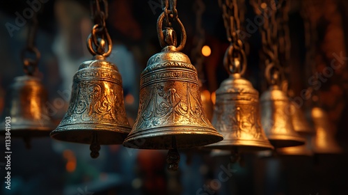 bell, metal, hanging, chain, bronze, gold, ancient, religious, culture, tradition, faith, spiritual, ornament, decor, design, art, craft, texture, pattern, detail, closeup, macro, photo, dark, light, shadow, warm, tone, ambience, atmosphere, vintage, antique, historic, heritage, symbol, sound, music, temple, church, prayer, worship, meditation, peace, serenity, harmony, object, still life, beauty, aesthetic