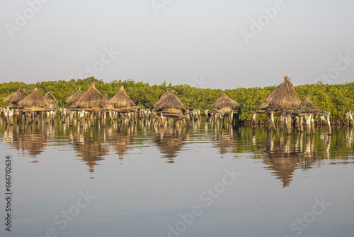Ancient granaries on an island among mangrove trees, Joal-Fadiouth, Senegal