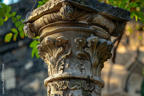 Ancient Greco-Roman hall interior with a circular stone podium surrounded by grand Corinthian columns. Beautiful simple AI generated image in 4K, unique.