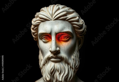 Ancient Greek bust, cracked stone, glowing eyes, dark background, old, mythology