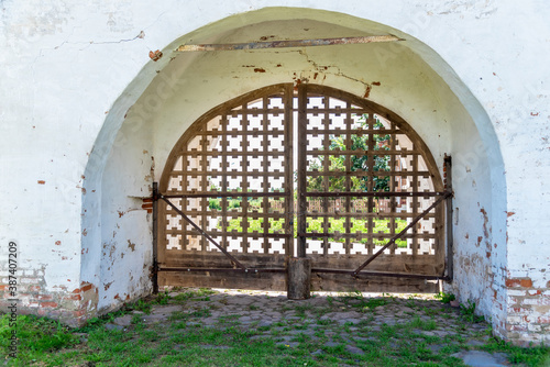 ancient, closed, gate, wall, architecture, historical, white, wide, thick, brick, building, green, grass, shadow, summer, day, grid, example, antique, architectural, style, in plaster, stucco, history, traditional, metal, ornament, design, detail, wooden, home, house, exterior, doorway, entrance, wood, door, arch, stone, historic, church, texture, vintage, brown, old, decoration, mediaeval, symmetry, facades, castle