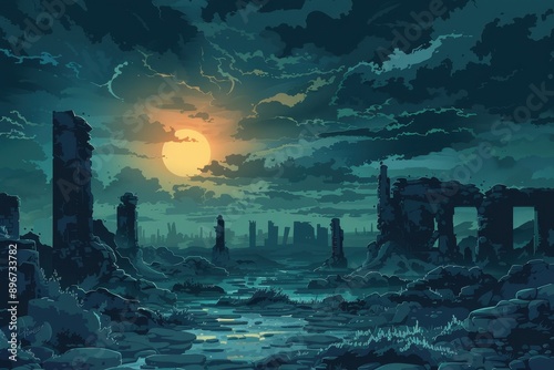 ruin, city, ancient, forgotten, sunset, sunlight, moon, night, sky, cloud, dark, blue, green, yellow, orange, red, purple, pink, black, white, grey, brown, stone, water, river, tree, plant, grass, moss, rock, debris, debris, overgrown, abandoned, desolate, apocalyptic, destruction, decay, time, lost, history, mystery, legend, myth, fantasy, imagination