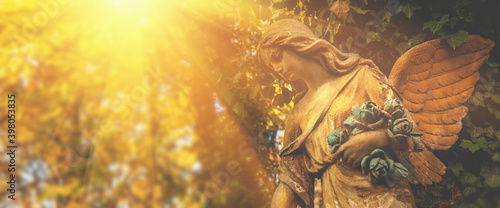 Ancient statue wonderful angel in the rays of sun.