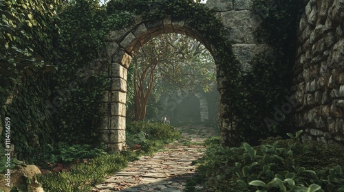 ancient stone archway leading to hidden garden, ivy creeping up walls, creating a sense of mystery and allure, perfect for exploration