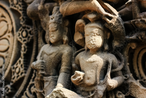 Ancient stone carvings on the walls of an ancient Hindu temple in Madhya Pradesh in India.